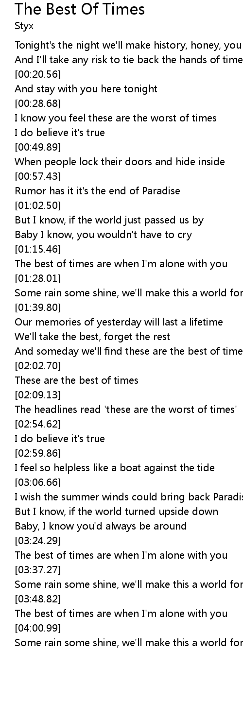The Best of Times is a song by American rock band Styx released as the first single from. I know you feel these are the worst of. Styx - The Best Of Times Lyrics Letras y canción para escuchar - Tonights the night well.